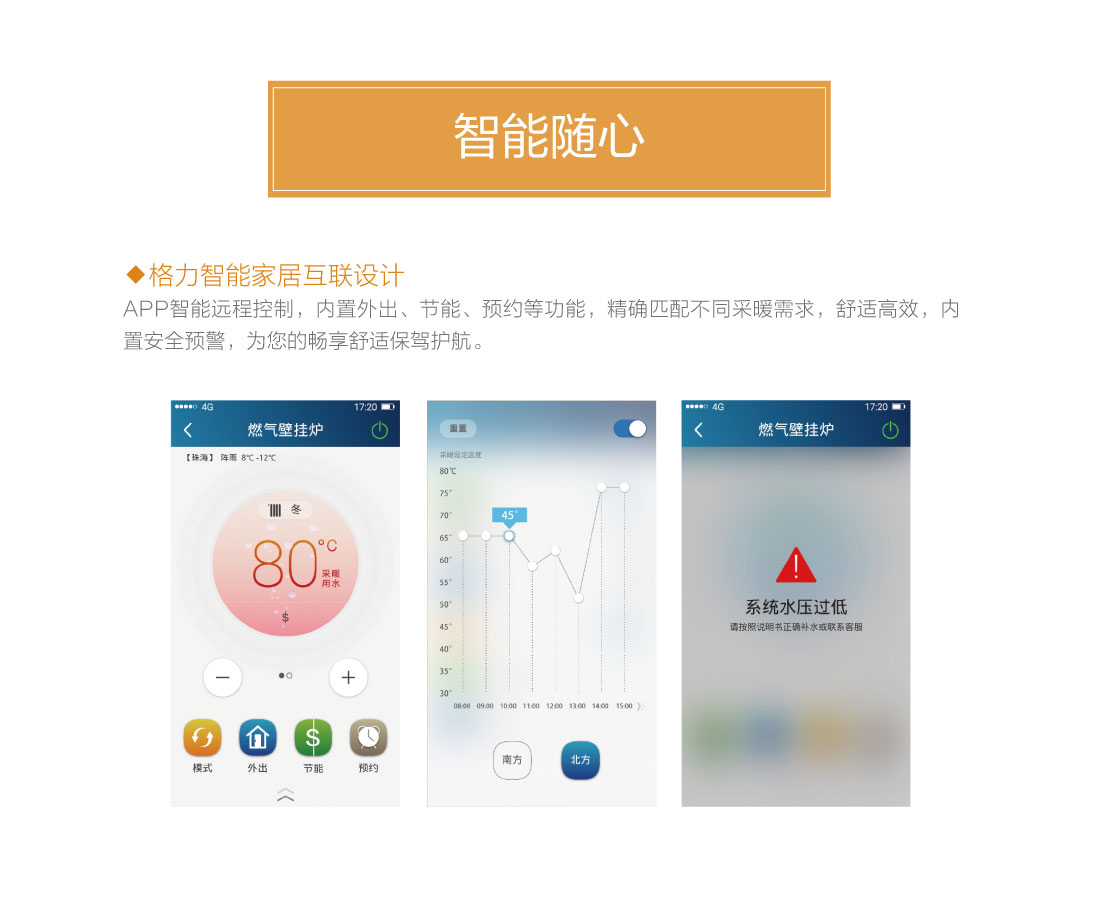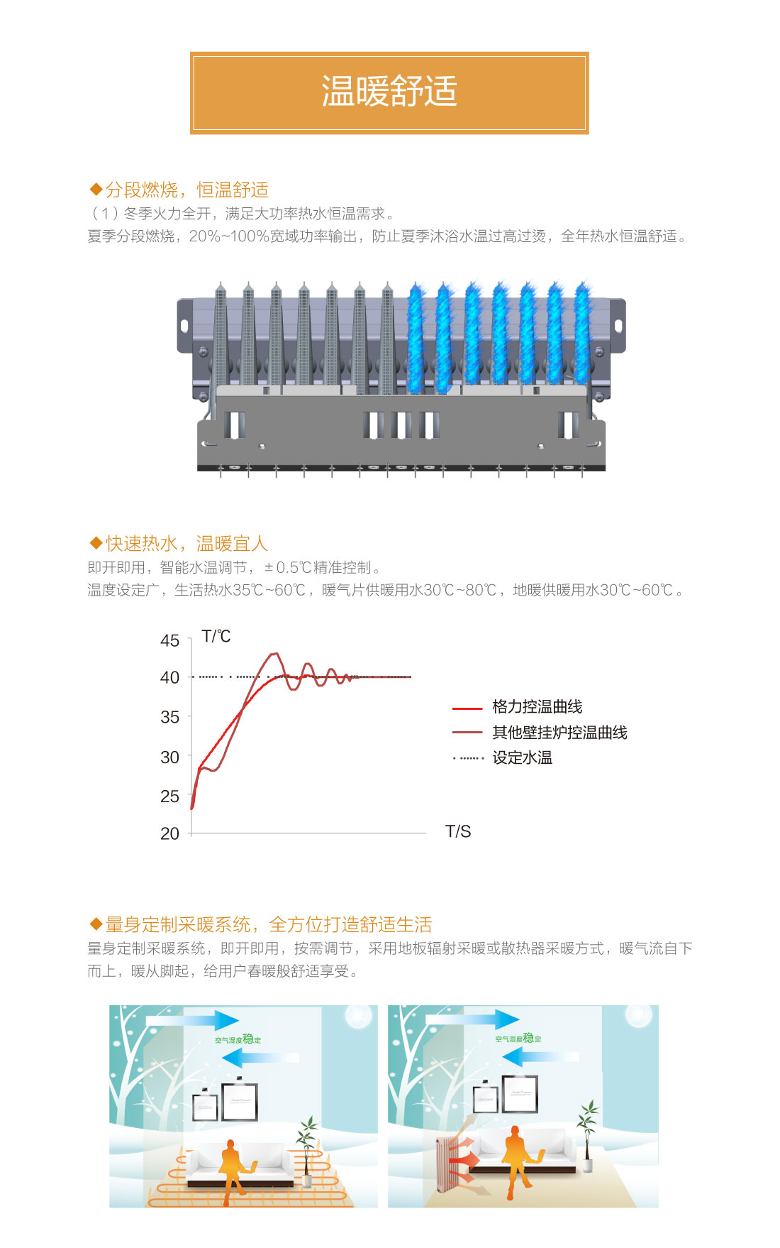 分段燃燒,20%~100%寬域功率輸出,防止夏季水溫過高過燙,智能水溫調節,±0.5℃精準控溫,溫度設定廣,生活熱水35℃~60℃,暖氣片供暖用水30℃~80℃,地暖供暖用水30℃~60℃